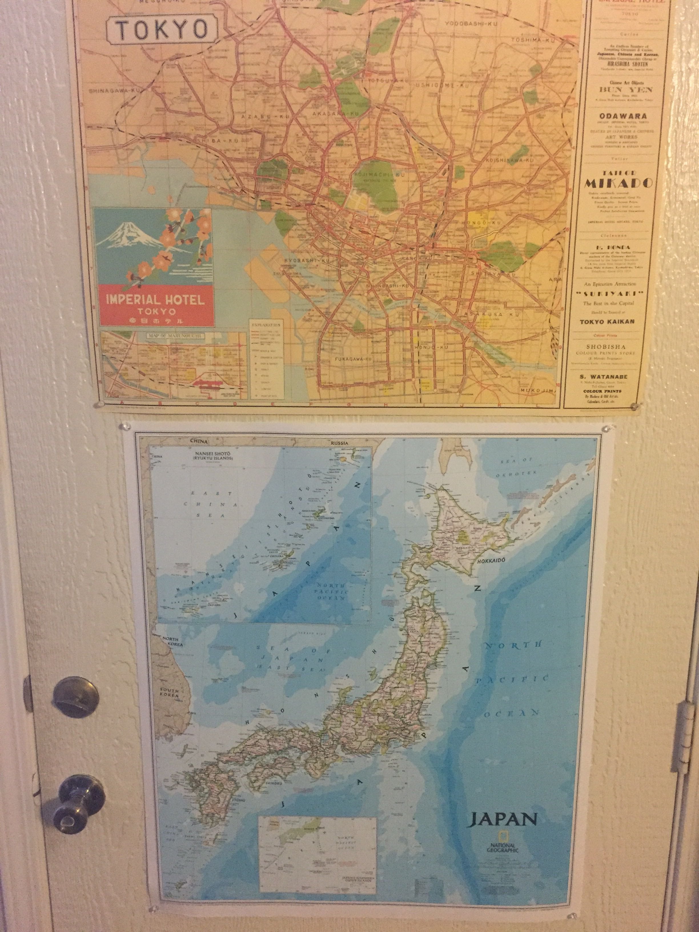 私は二枚の日本の地図を買った。ご覧のとおり、東京一枚、日本の国一枚。この写真は私の正面玄関にある。