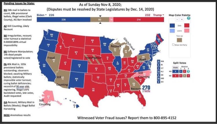 今のところ、アメリカのメディアは非常に無責任であることを覚えておくことは重要です。私の意見では、彼らが11月7日に選挙結果を宣言したとき、彼らは南北戦争を宣言しました。選挙人団がAP通信が間違っていたことを示したとき、政治的左翼はかつてないほど怒っているだろう。わかりました、「しかし、クラッチさん、あなたが間違っている場合はどうなりますか?選挙人団が今年の12月にバイデンに投票した場合はどうなりますか?」と言うかもしれません。私は言うだろう「笑、私は間違っていません。5ドル賭けます。」 ($ 5は、私が今賭けても構わないと思っているすべてです。)トランプさんがさらに4年間政権を維持しない場合、政治的右翼は非常に怒ります。国はいくつかの注目すべき変化を見るでしょう。それはアメリカが2つあるような気がします。