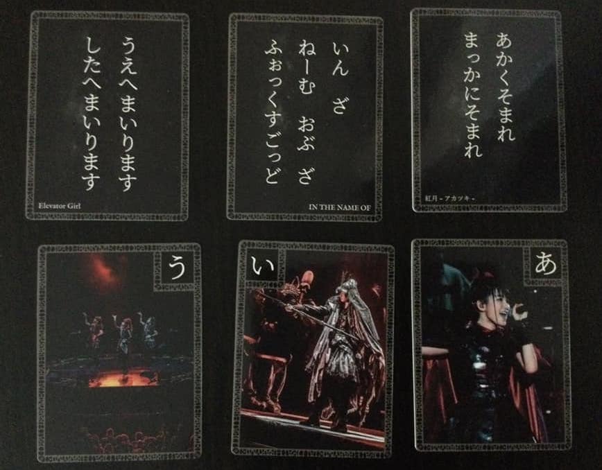 昨年、限定版のベビーメタルのグッズを注文しました。 アイテムのひとつがかるたセットでした!かるたをしたことはありません。だから、私は学ぶ必要があります。ベビーメタルのかるたのカードがとても綺麗!