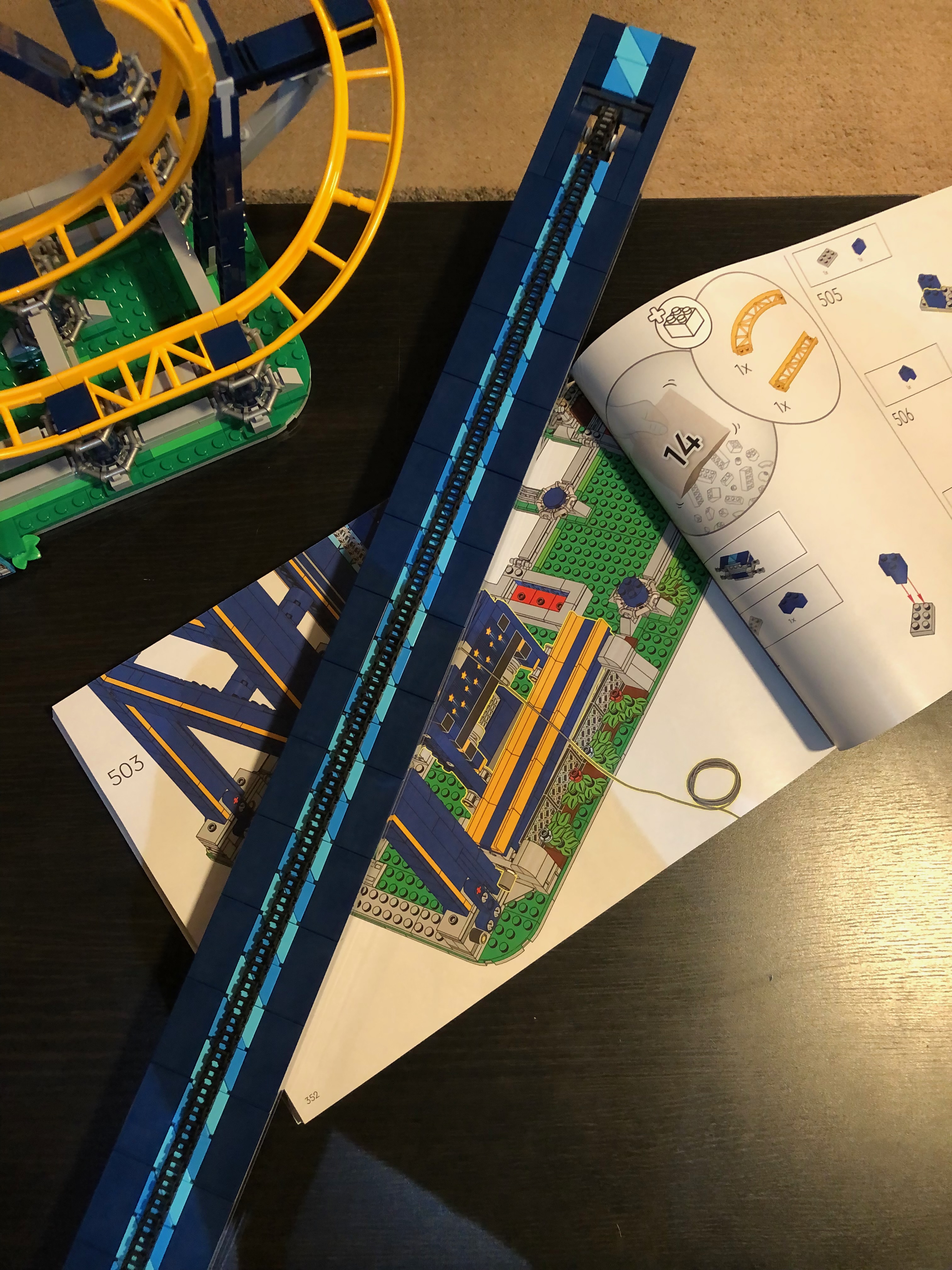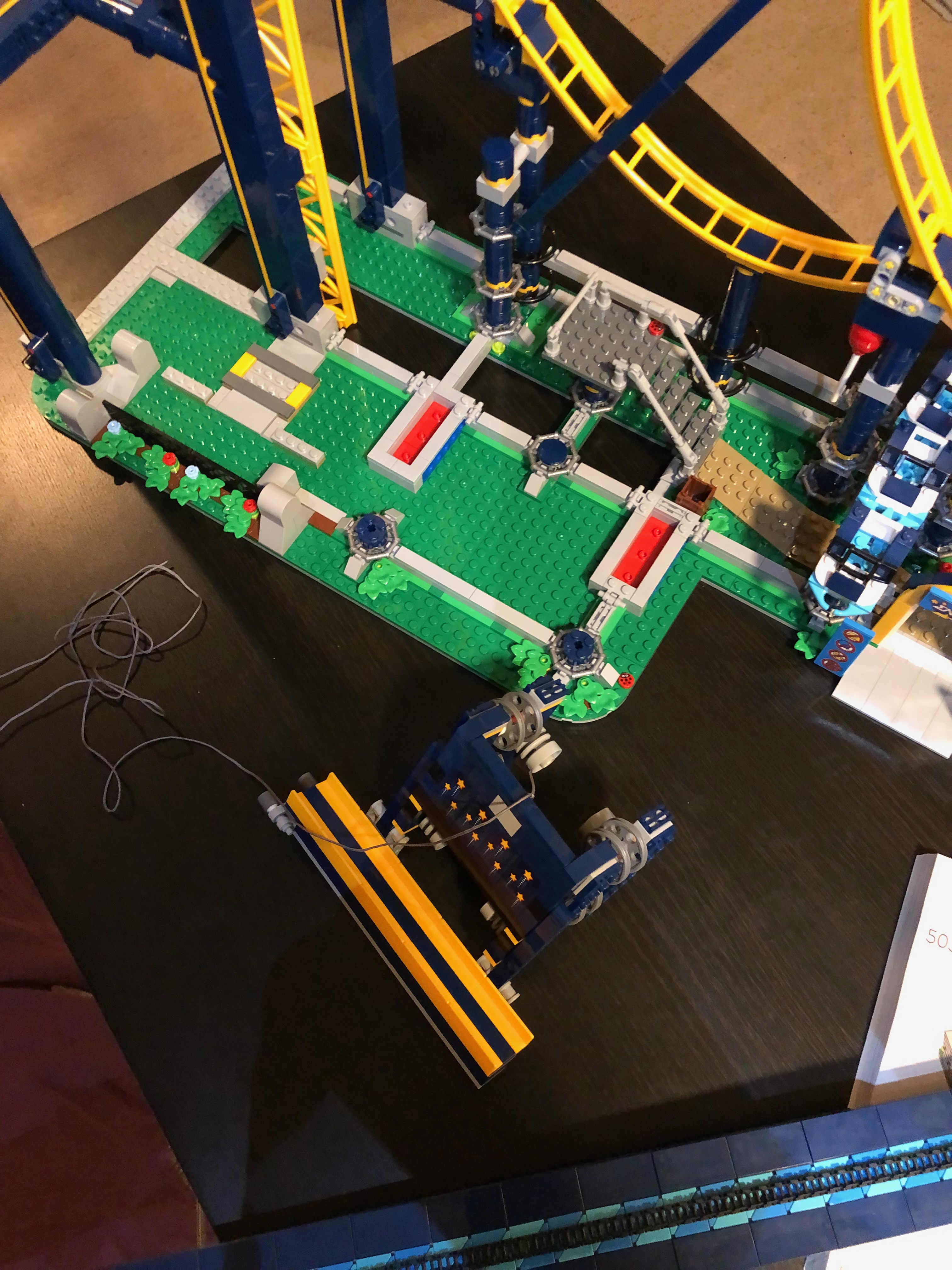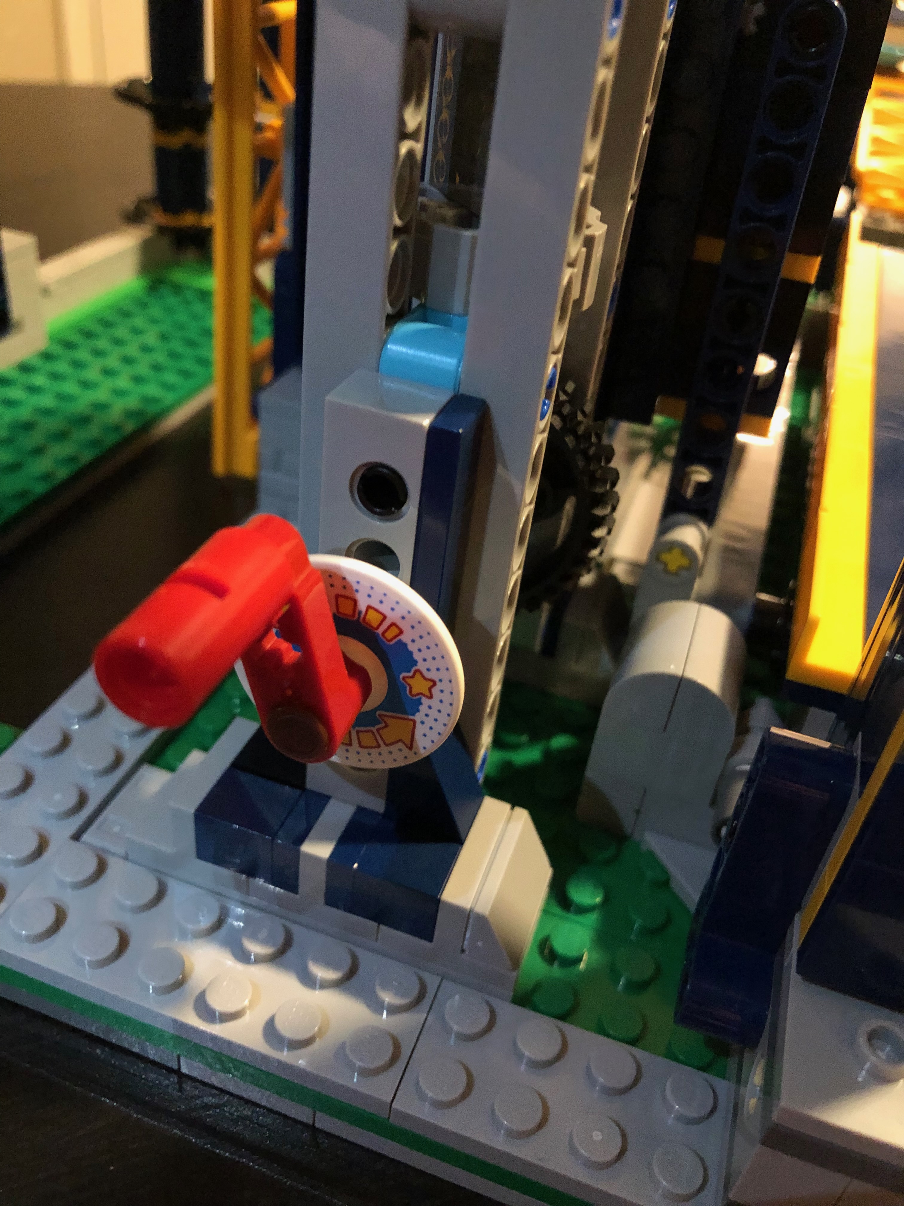 私の意見では、このレゴ セットは、他のセットに比べてやや速く、簡単に組み立てることができました。かなりの時間がかかりましたが、思ったほどではありませんでした。途中でいくつかの興味深い驚きがありました。 レゴの会社は、デザインにおいていくらか前向きな考え方をしなければなりませんでした。たとえば、トラックの終わりに向かってゴム製のタイヤがあり、ローラー コースターのカートが減速するのに役立ちます。トラックの終わりにはブレーキーストップもあります。これはコースターのエレベーターが乗船する準備が整うと、邪魔にならないように移動します。そして、エレベーターがコースターをトラックの上部に移動し始めると、これは元の位置に戻ります。とても賢いデザイン!