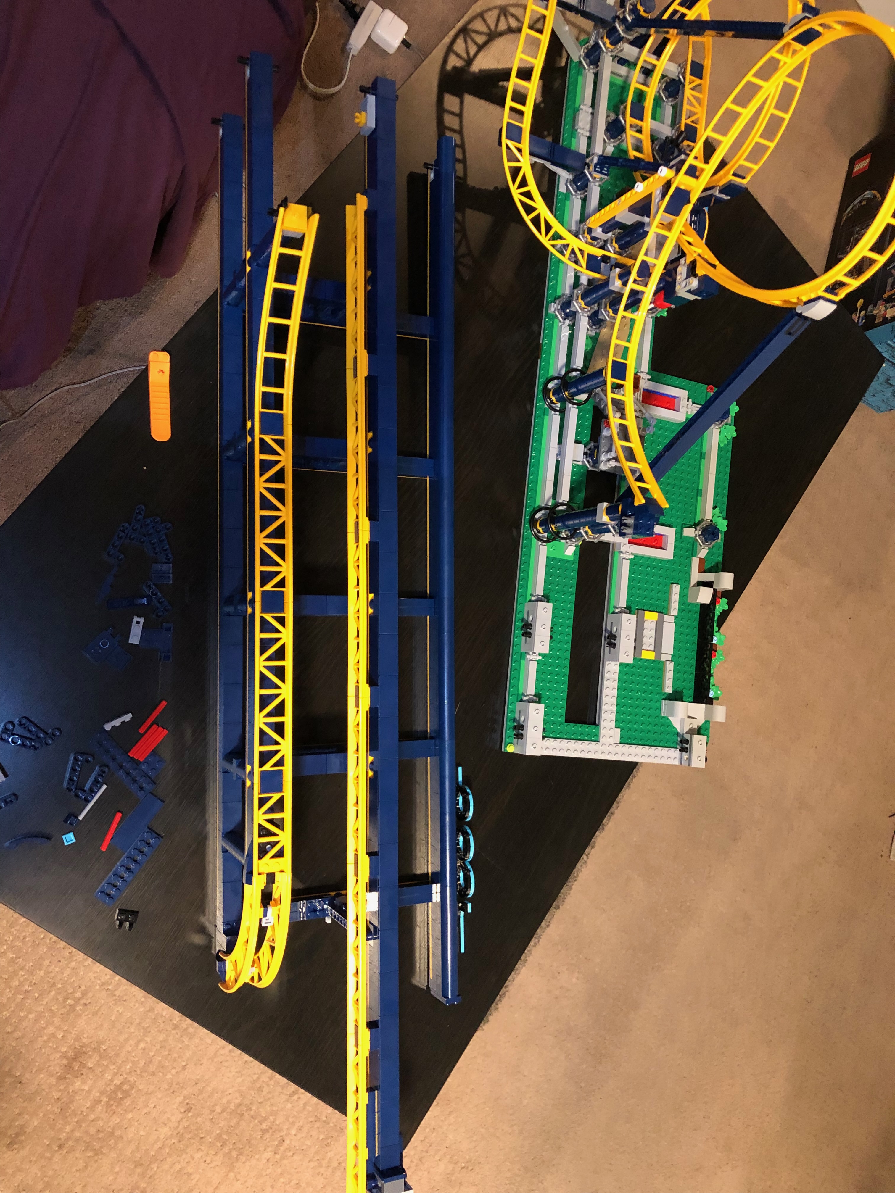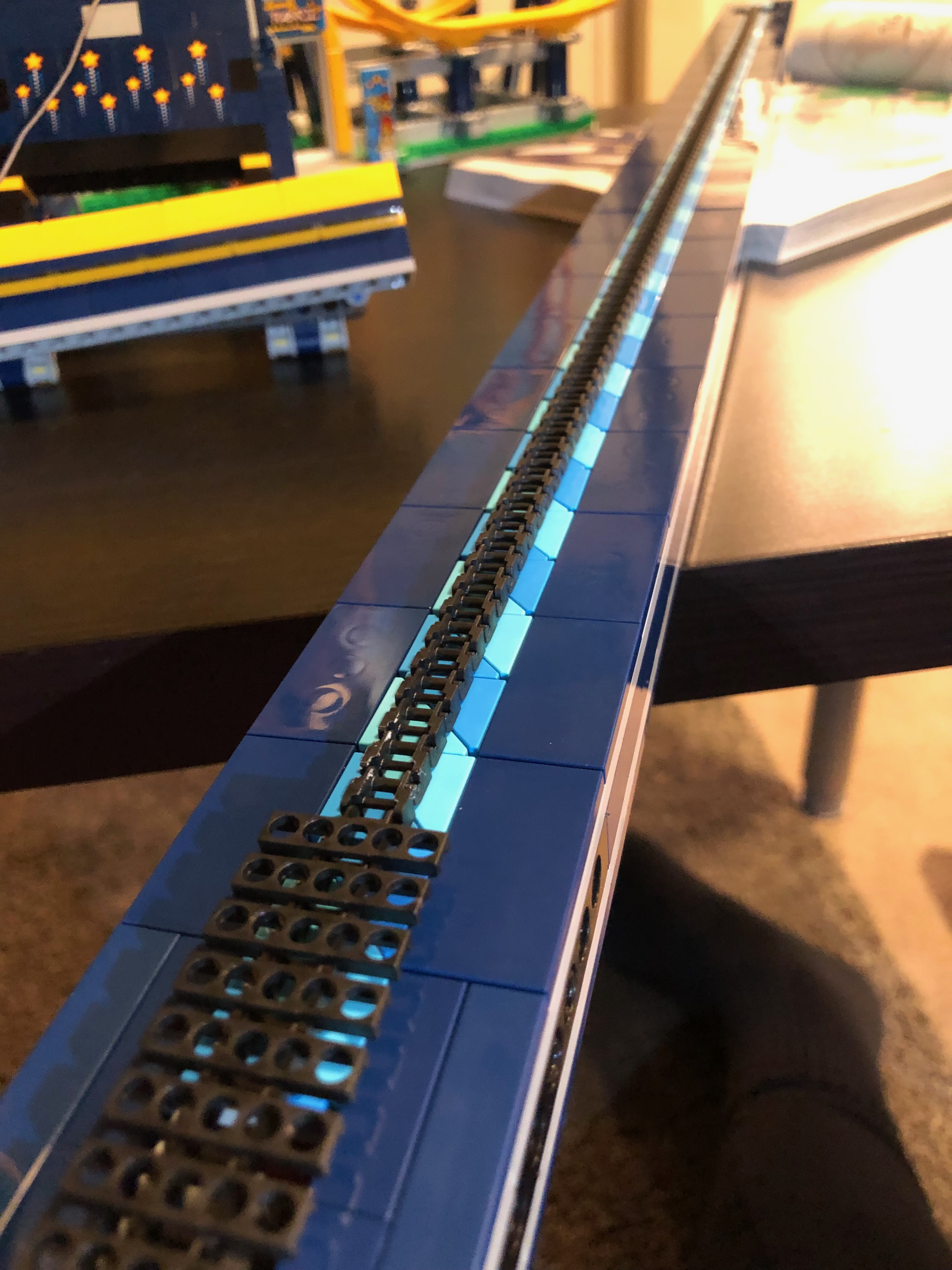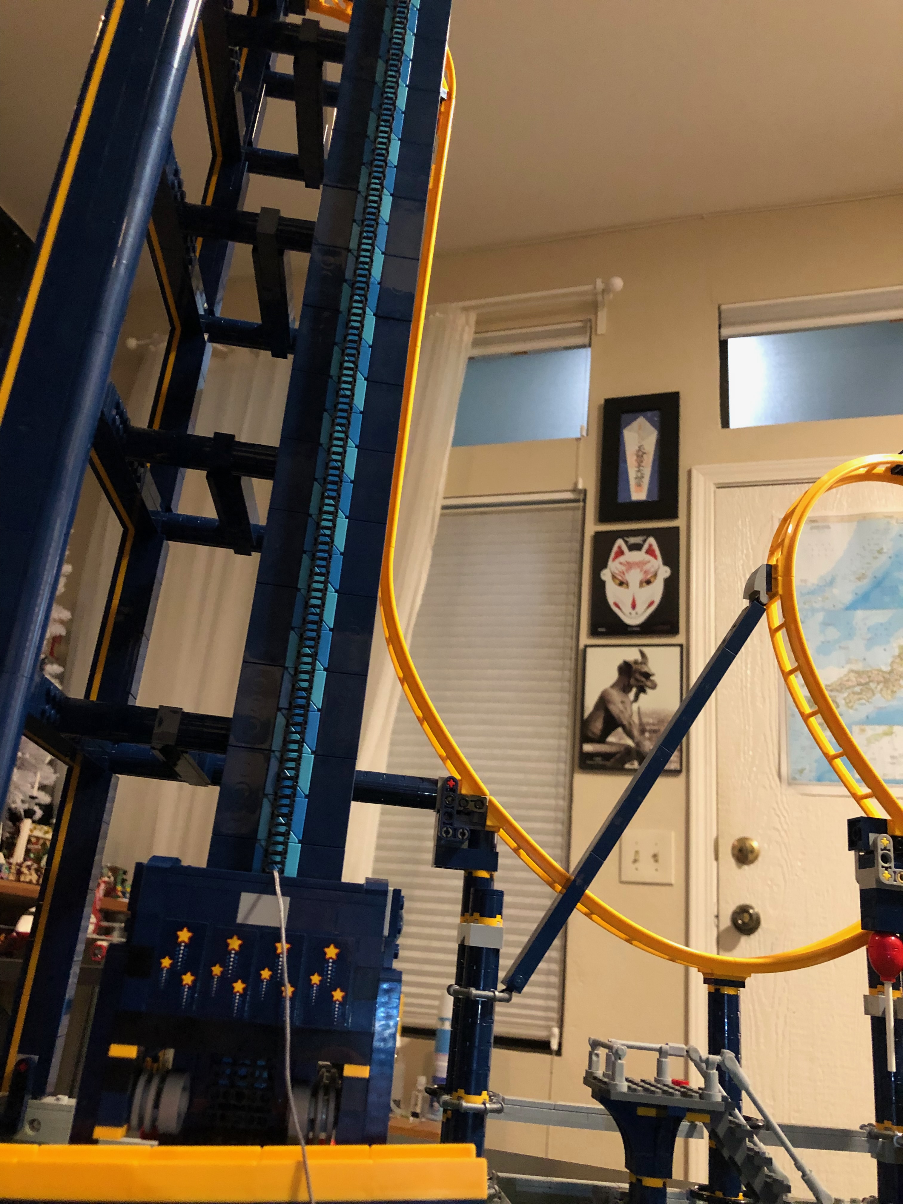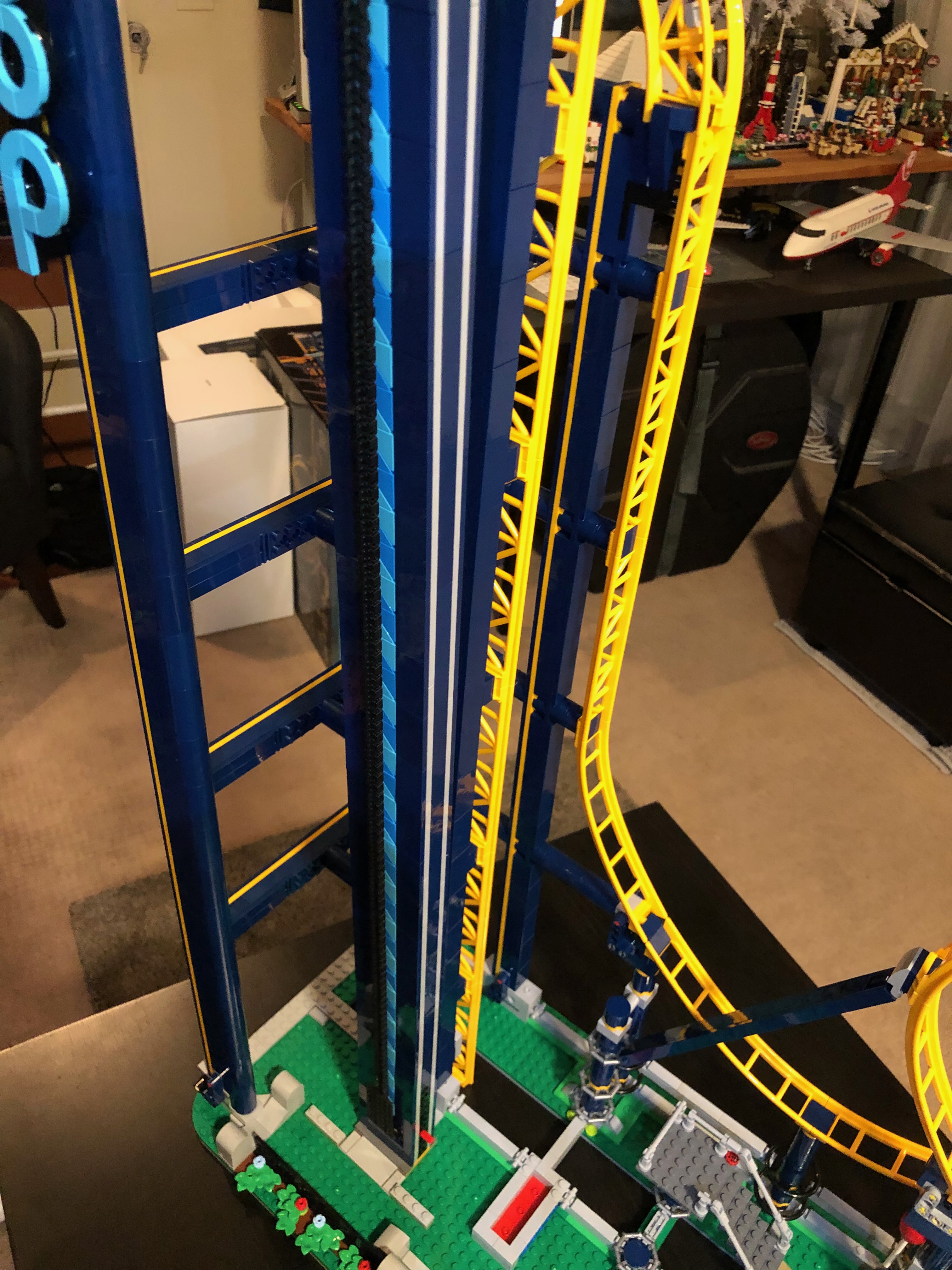 私の意見では、このレゴ セットは、他のセットに比べてやや速く、簡単に組み立てることができました。かなりの時間がかかりましたが、思ったほどではありませんでした。途中でいくつかの興味深い驚きがありました。 レゴの会社は、デザインにおいていくらか前向きな考え方をしなければなりませんでした。たとえば、トラックの終わりに向かってゴム製のタイヤがあり、ローラー コースターのカートが減速するのに役立ちます。トラックの終わりにはブレーキーストップもあります。これはコースターのエレベーターが乗船する準備が整うと、邪魔にならないように移動します。そして、エレベーターがコースターをトラックの上部に移動し始めると、これは元の位置に戻ります。とても賢いデザイン!