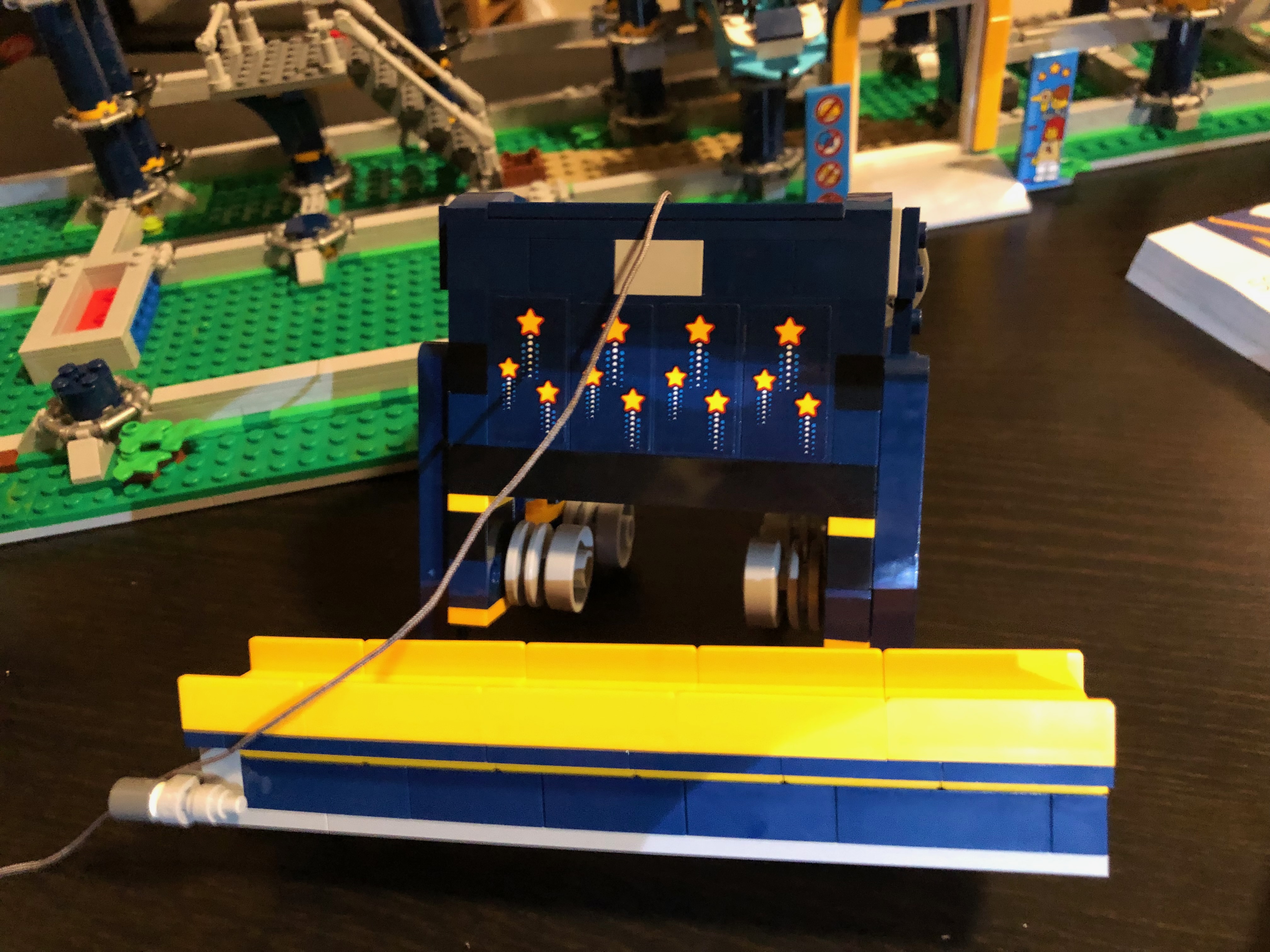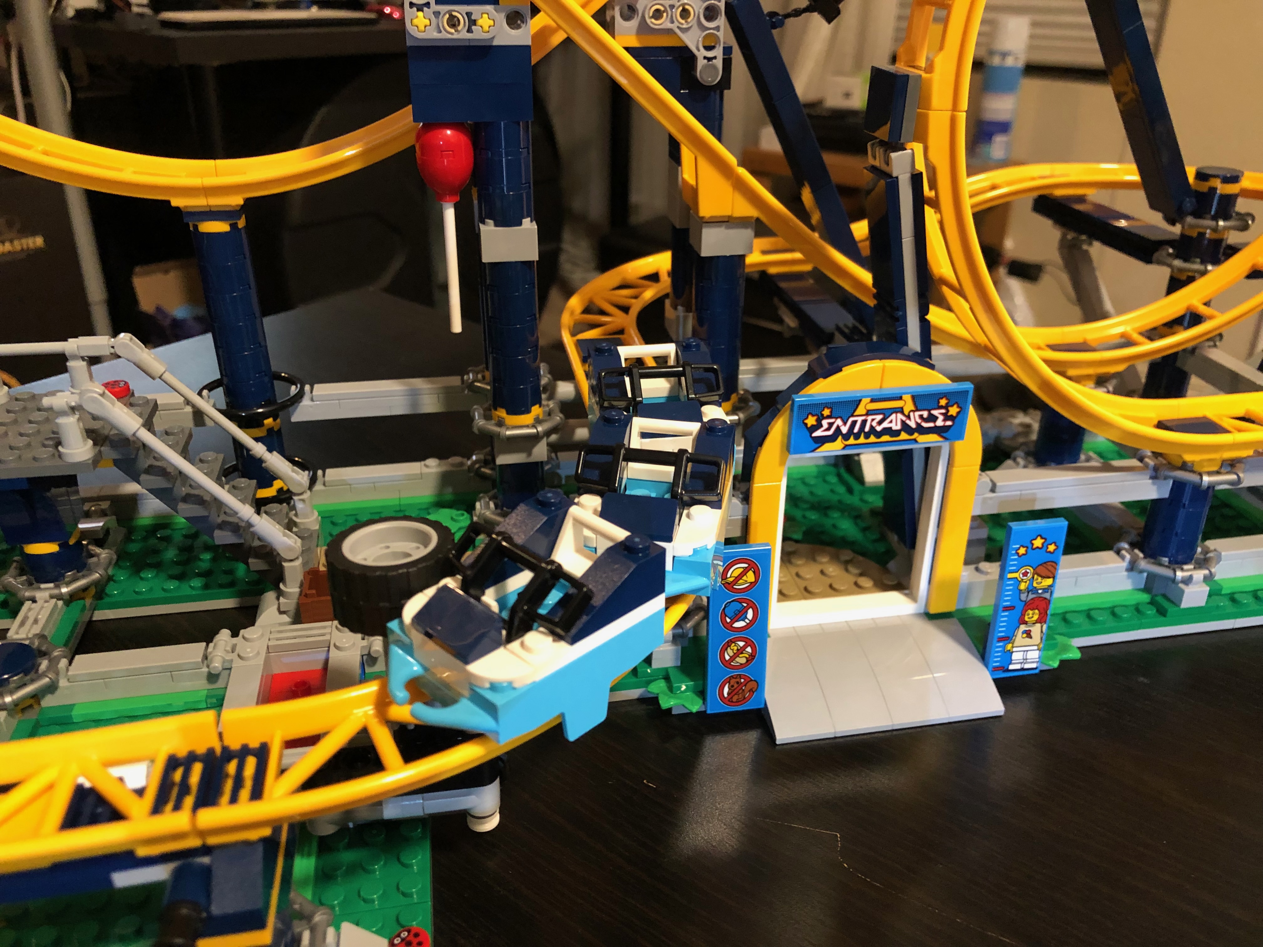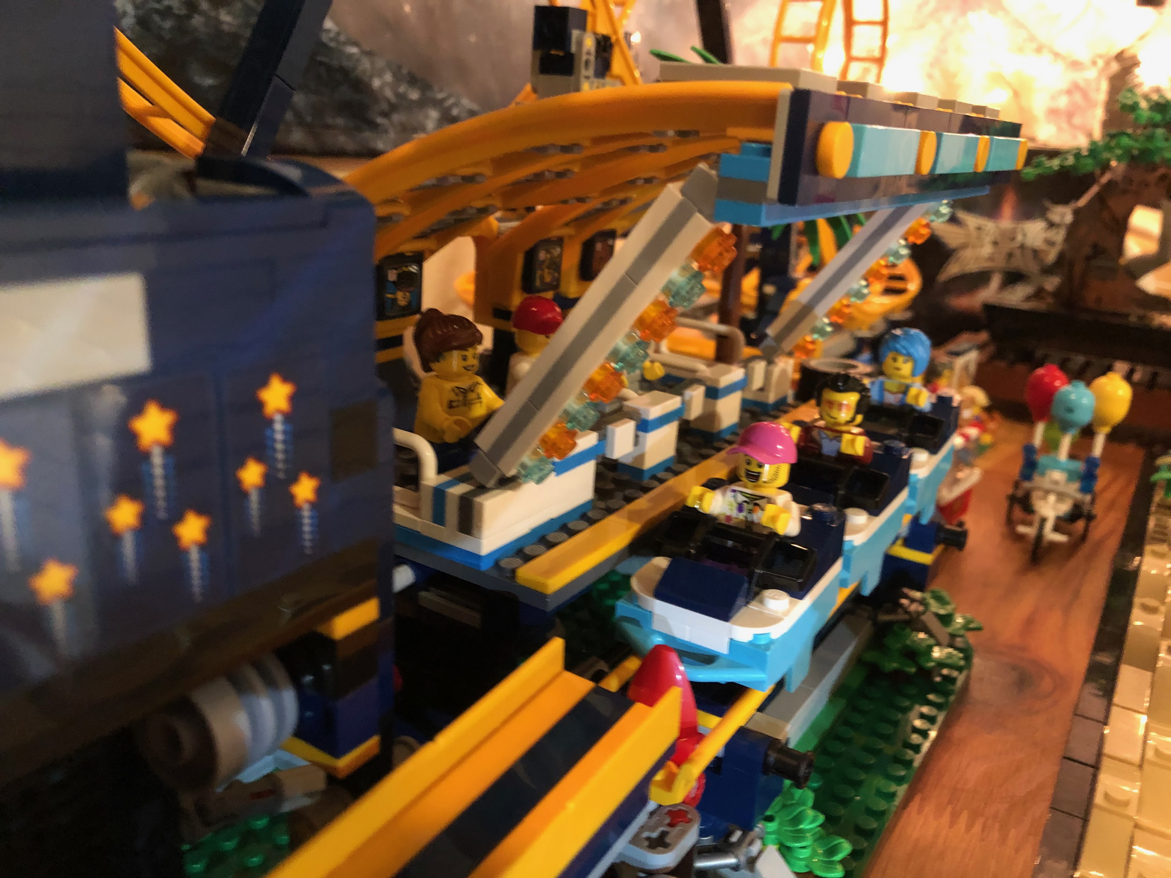 また、チケット売り場内には、ジェットコースターのライダーが上下逆さまになってループをくぐる写真のような小さなシールが! 実際、デザインの一部には、ループの近くに偽のカメラが含まれています。とてもかわいい!このセットはとても楽しく、コースターが線路を横切ってレースするのを見るのはとても楽しいです。