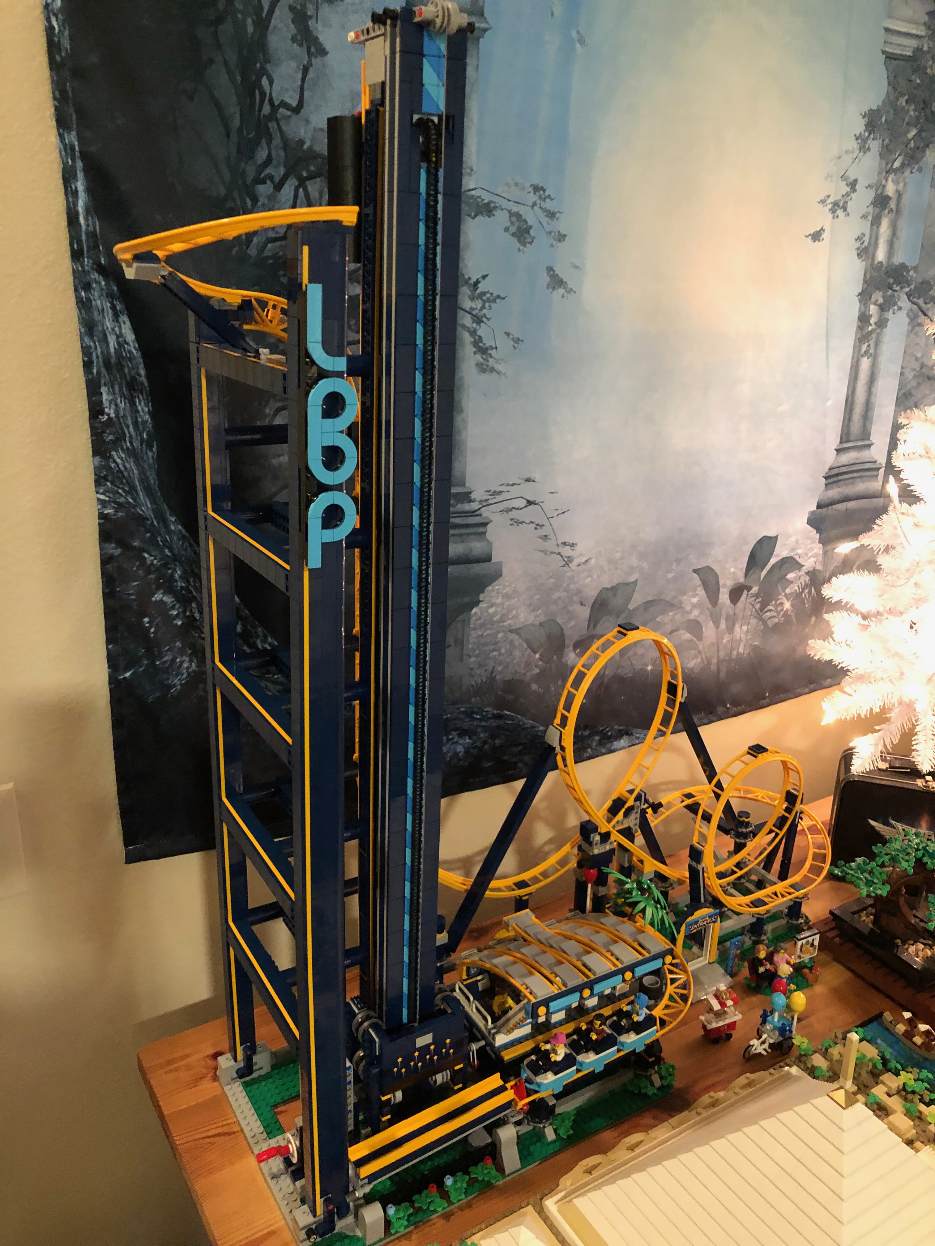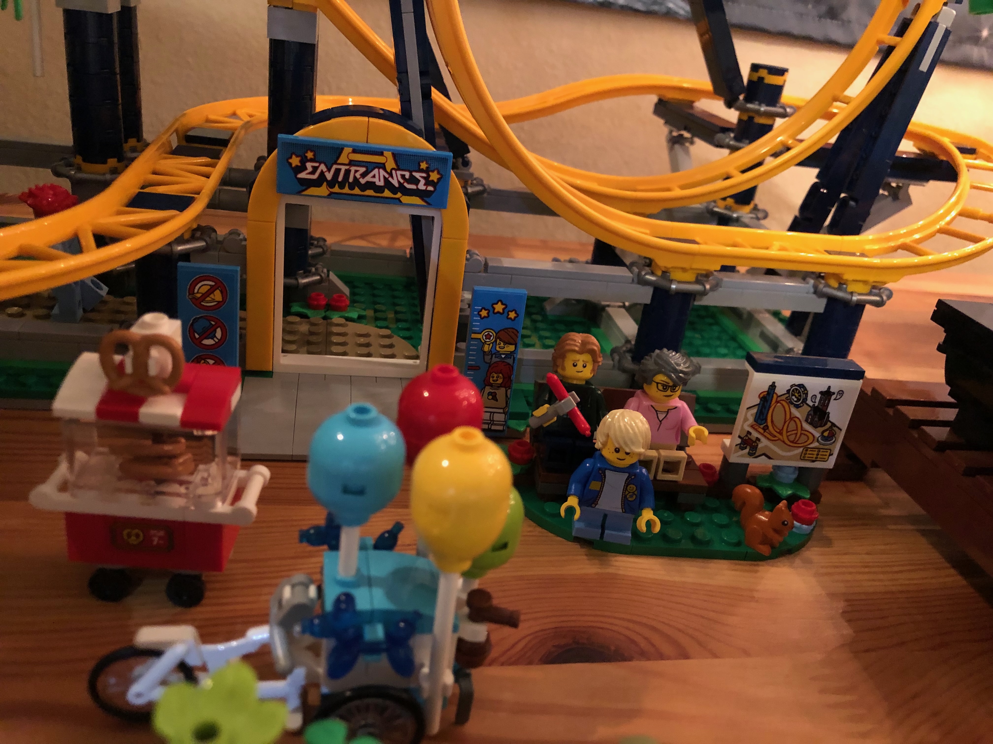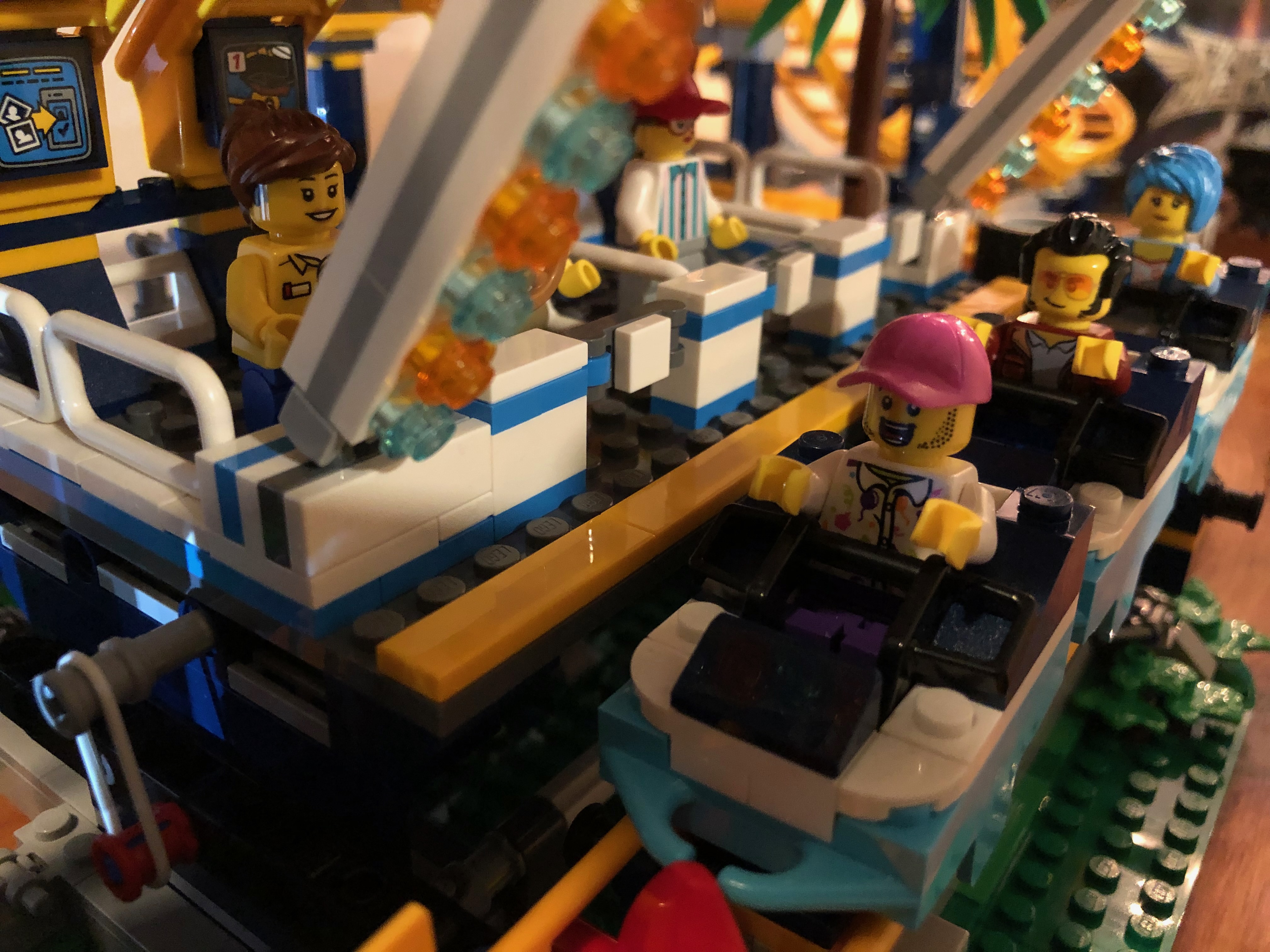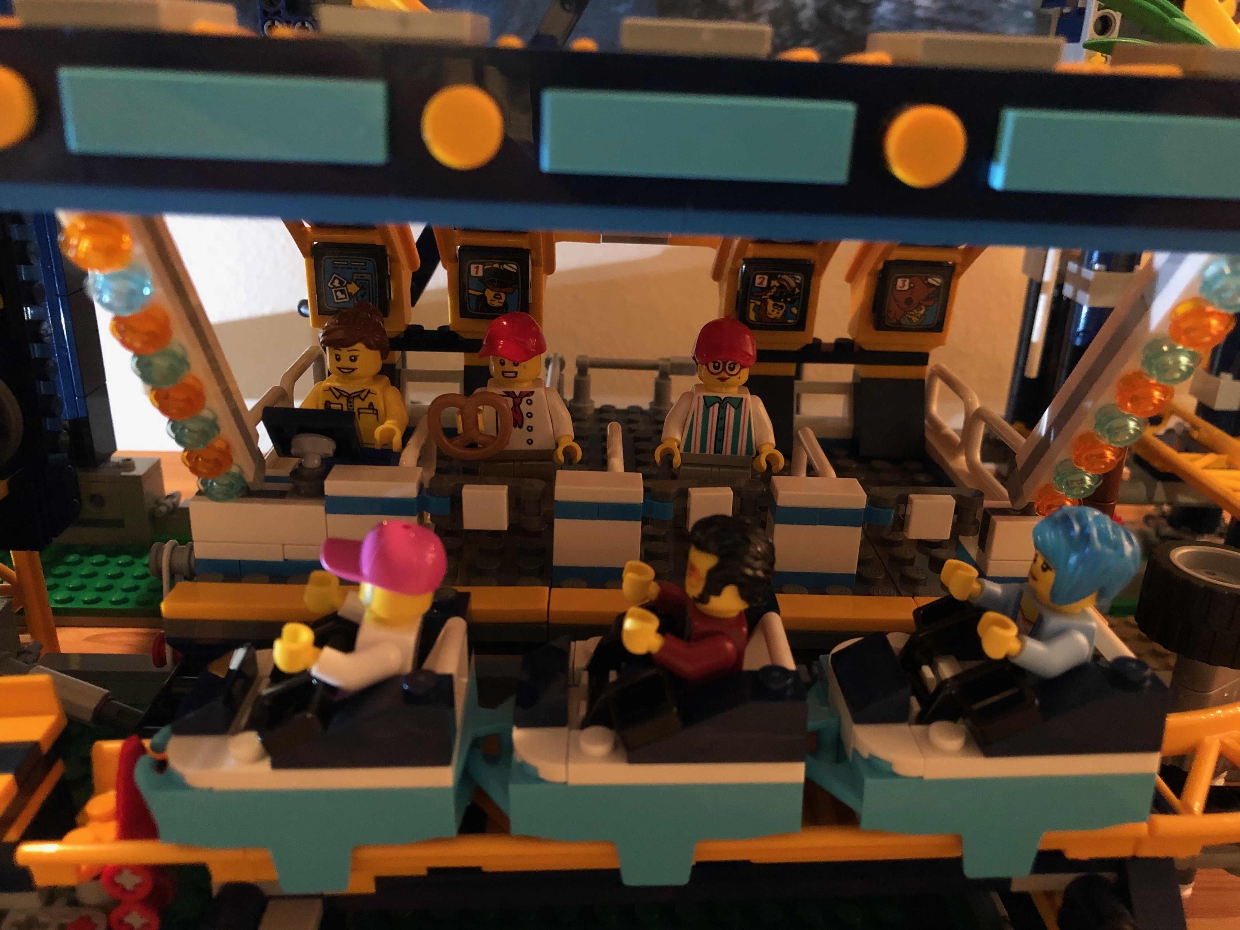また、チケット売り場内には、ジェットコースターのライダーが上下逆さまになってループをくぐる写真のような小さなシールが! 実際、デザインの一部には、ループの近くに偽のカメラが含まれています。とてもかわいい!このセットはとても楽しく、コースターが線路を横切ってレースするのを見るのはとても楽しいです。