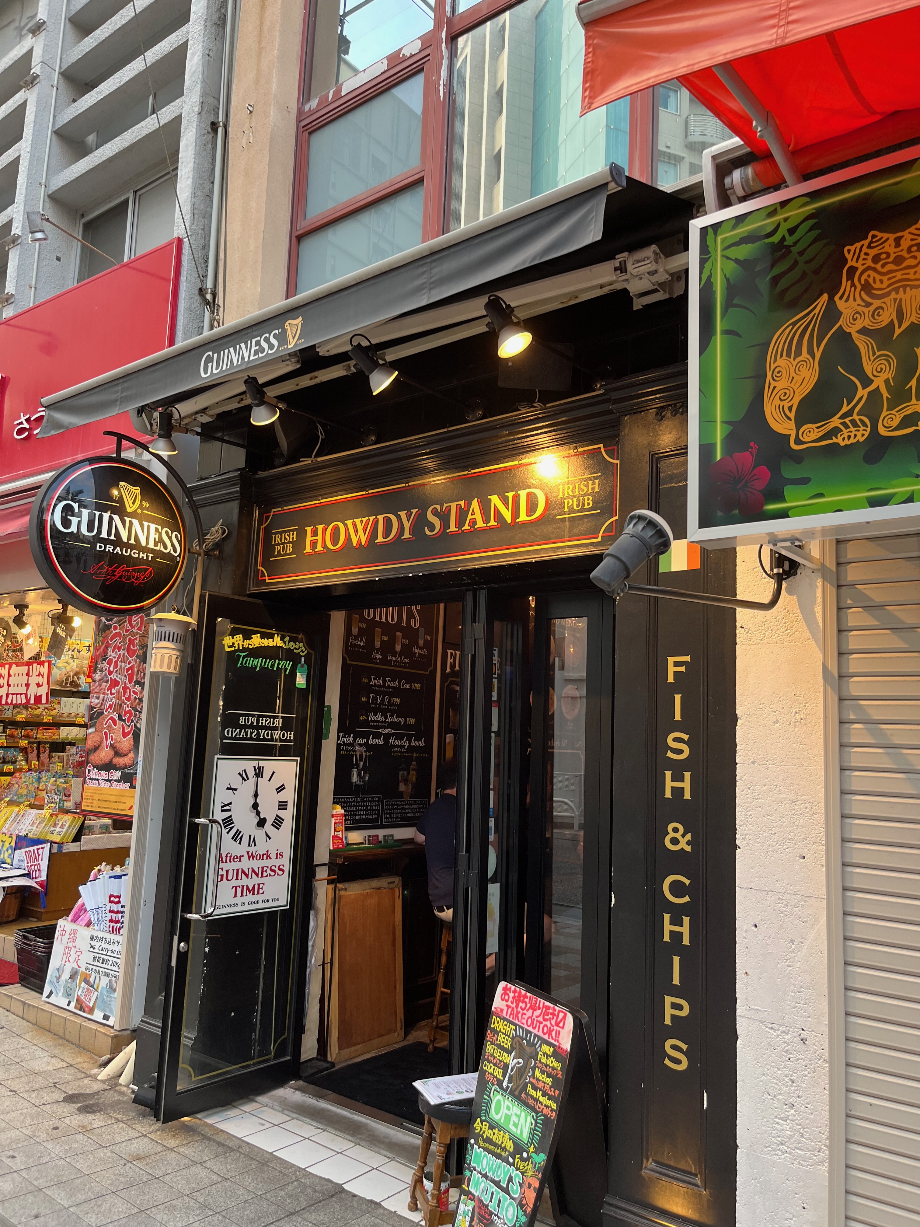 残りの日は国際通りをぶらぶら歩きました。もう 1 つ興味深いのは、私の初日がアイルランドの祝日である聖パトリックの日だったことです。 なんと、国際通りにアイリッシュパブを発見!アイルランドの祝日だったので、アイリッシュ パブでビールを飲むのもいいと思いました。ここでハブ酒について学びました。クレイジー!瓶の中にへびが入った泡盛のお酒です!何てことだ!試したことはありませんが、将来沖縄に戻ったときに試してみるかもしれません。