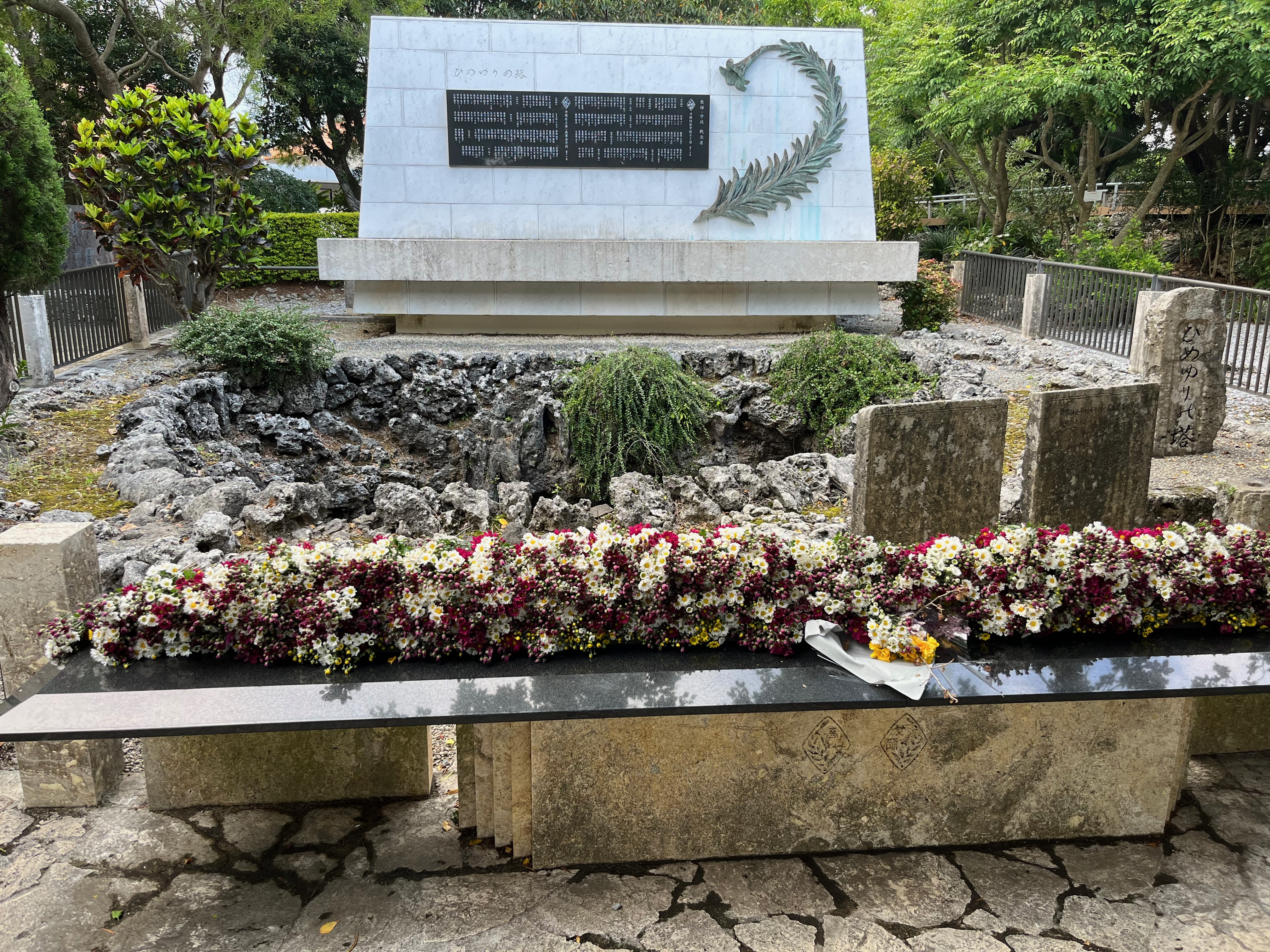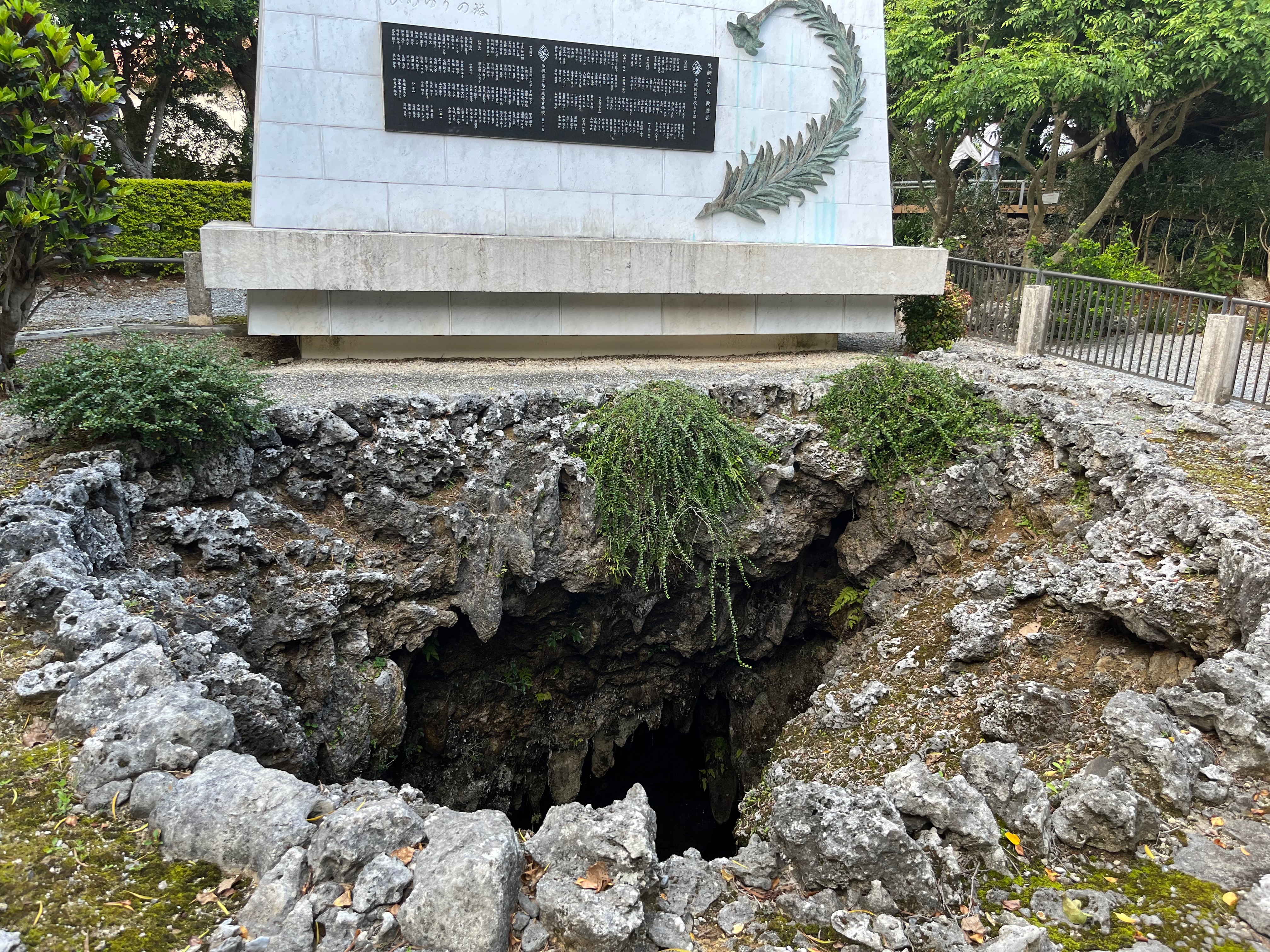 公園を出た後、私たちは2つの異なる洞窟へ車で行きました。洞窟の中には入りませんでしたが、洞窟の入り口だけを見ることができました。( 私たちが訪れた洞窟には人々が入ることを許可されていないと思います。)1945 年の沖縄戦で日本軍はこれらの洞窟を使用しました。洞窟は戦時中病院として使用されていました。 私たちが訪れた洞窟の 1 つは、ひめゆりの女子の学徒たちが使用していた洞窟です。学生たちは看護ユニットに編成されました。残念ながら、ひめゆり平和祈念資料館は閉館していました。 でも、ひめゆりの慰霊碑は見ることができました。悲劇的に、沖縄戦では多くの人が洞窟で亡くなりました。もちろん、戦争記念館を訪れるのは簡単ではありません。 私の意見では、洞窟は戦争記念碑をもう少し強烈なものにします。 洞窟は当然怖いものです。 洞窟で看護師や負傷兵になることを想像するのは簡単ではありません。