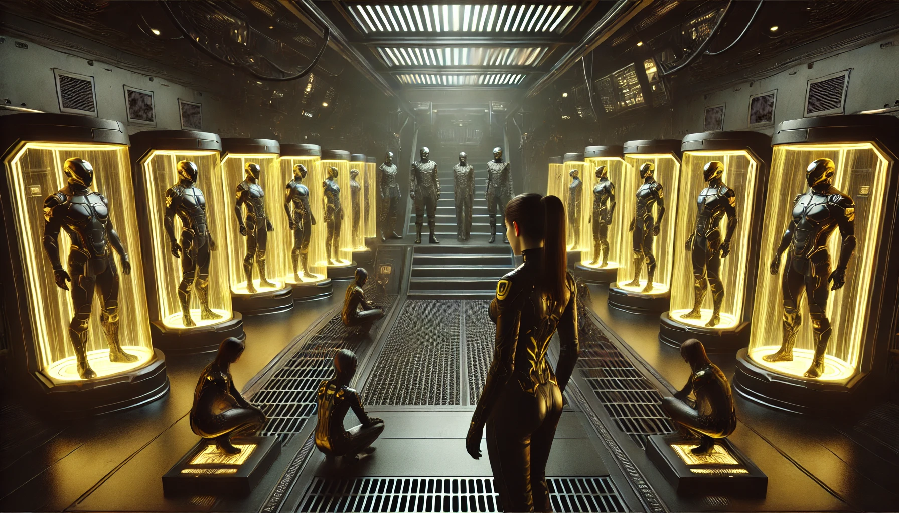 猫の本能が彼女を支配した。彼女は手足を自由に曲げたが、彼女のスーツは違っていた。滑らかで、強化されていた。黒と黄色のアクセントが暗い素材を背景にかすかに輝いていた。彼女は独房の中にいたが、壁は透明で、エネルギーバリアが静かに響いていた。